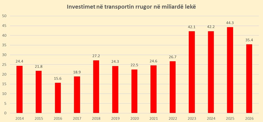 Sipas të dhënave nga Ministria e Financave, investimet në infrastrukturën rrugore janë rritur me shpejtësi vitet e fundit, duke nisur nga një nivel prej 24.4 miliardë lekësh në vitin 2014, në 44.5 miliardë lekë më 2025.