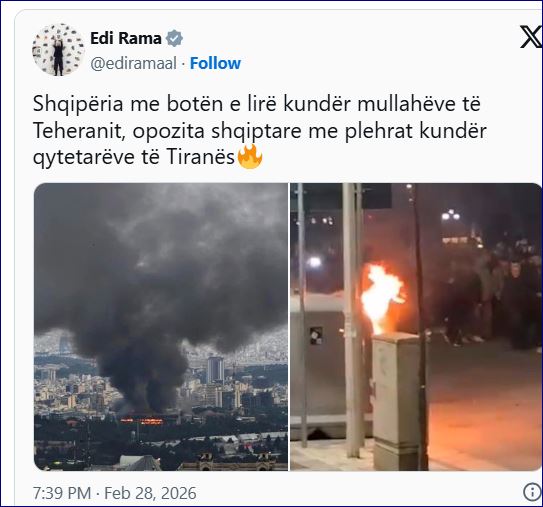 Në një postim në rrjetin social X, kryeministri ka ndarë dy fotografi nga sulmet amerikano-izraelite në Teheran, si edhe një kosh që ka marrë flakë nga molotovët që hodhën protestuesit në Tiranë.