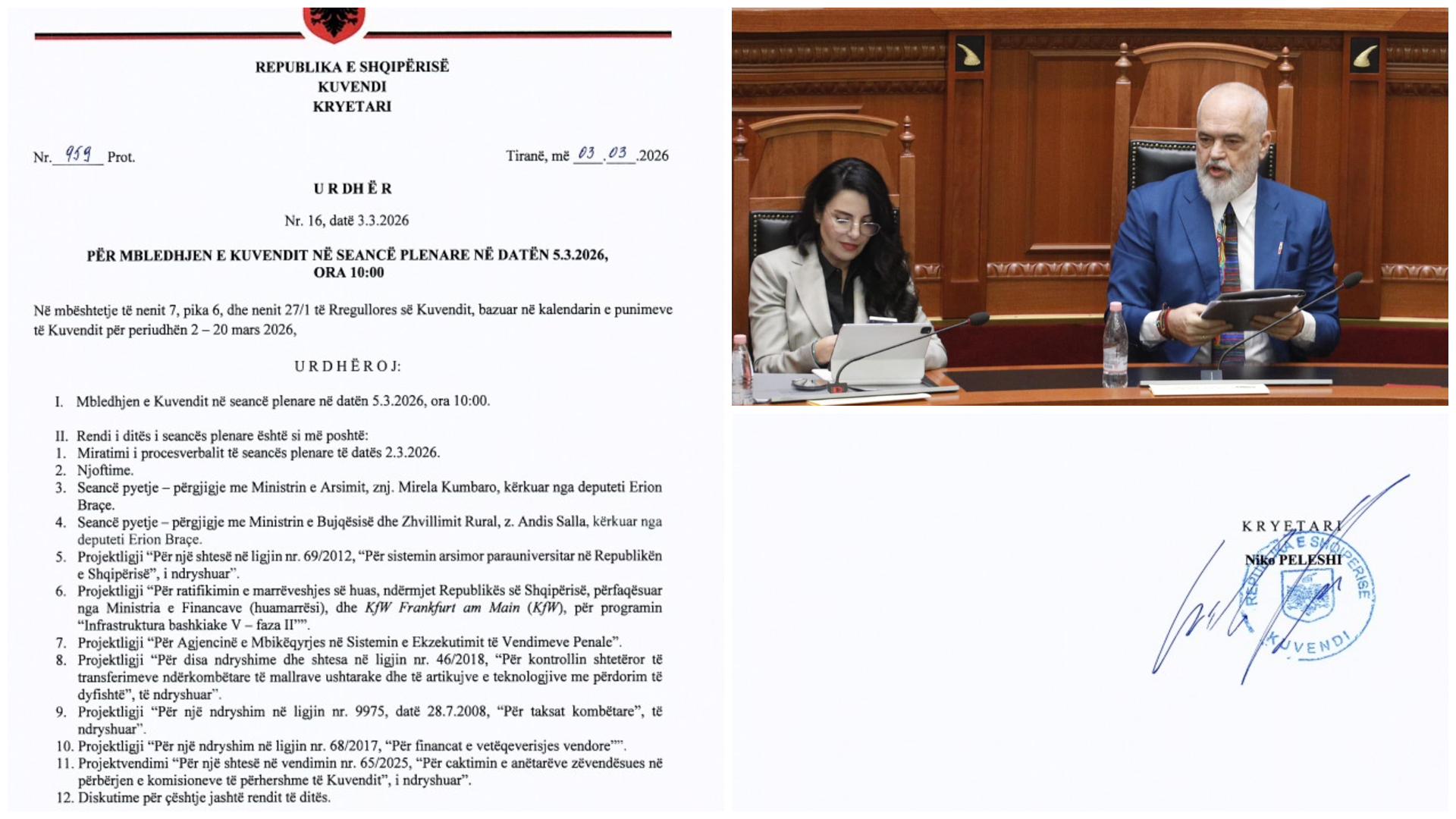 Në rendin e ditës nuk është përfshirë çështja e ish-zv kryeministres dhe ish-ministres së Infrastrukturës dhe Energjisë, Belinda Balluku, për të cilën SPAK kërkon arrestimin dhe i ka kërkuar Kuvendit heqjen e imunitetit si deputete.