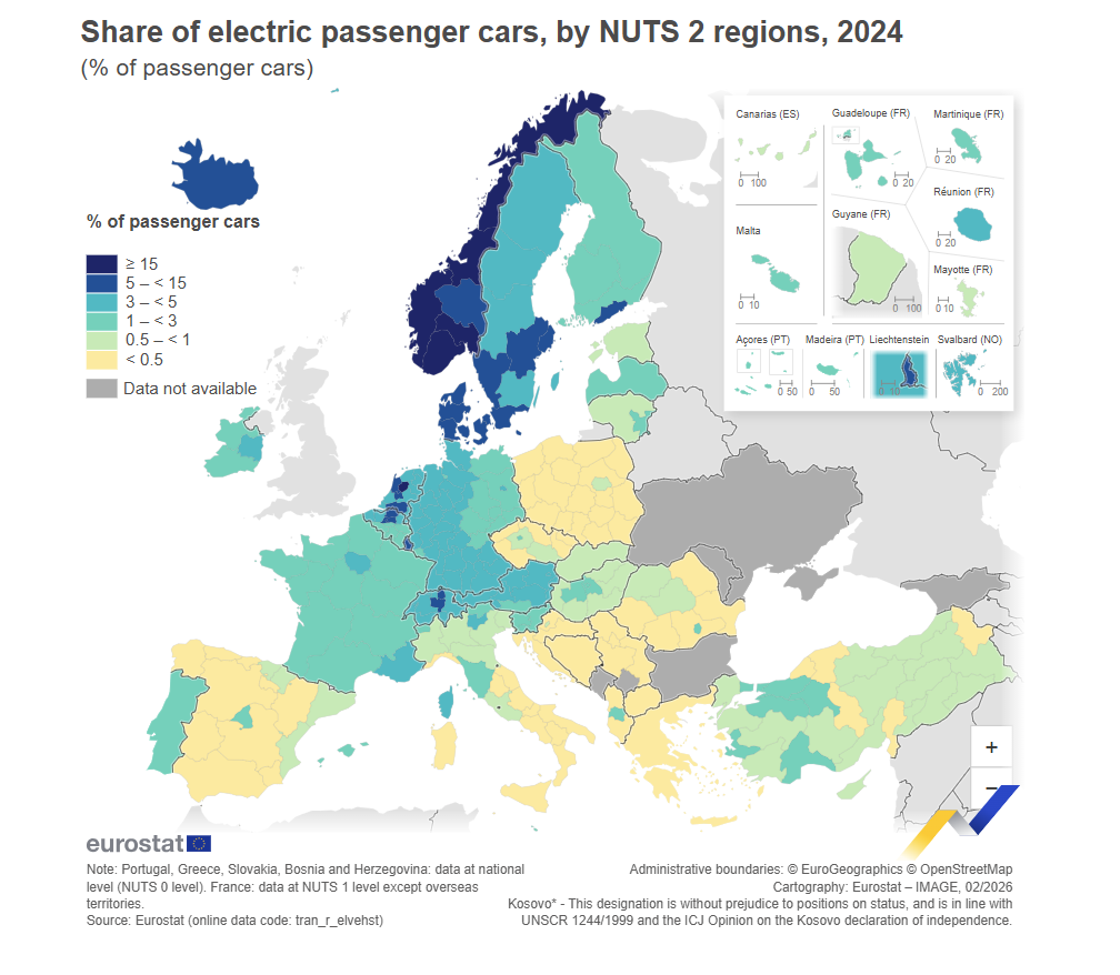 Sipas Eurostat, në vitin 2024, pjesa më e madhe e makinave elektrike të pasagjerëve në raport me totalin e makinave të pasagjerëve u regjistrua në rajonet veriore të Bashkimit Europian.