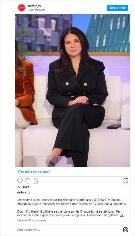 Përmes një postimi nga media e saj, Dritare TV, sqarohet se gjendja shëndetësore e Xhungës është stabilizuar dhe se ndodhet nën kujdesin e mjekëve.