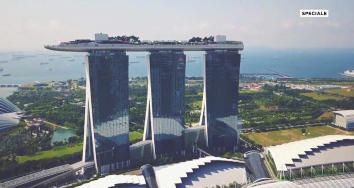 Marina Bay Sands Hotel në Singapor është një kompleks prej tre kullash që mbajnë në shpatulla një platformë në formë anijeje, me pishinë e tarracë panoramike. Kjo megastrukturë tashmë është bërë simbol i Singaporit, u inaugurua në vitin 2010 dhe vijon të jetë ikonë e arkitekturës së të ardhmes. Një ditë në një spa panoramike në çati kushton rreth 500 euro.