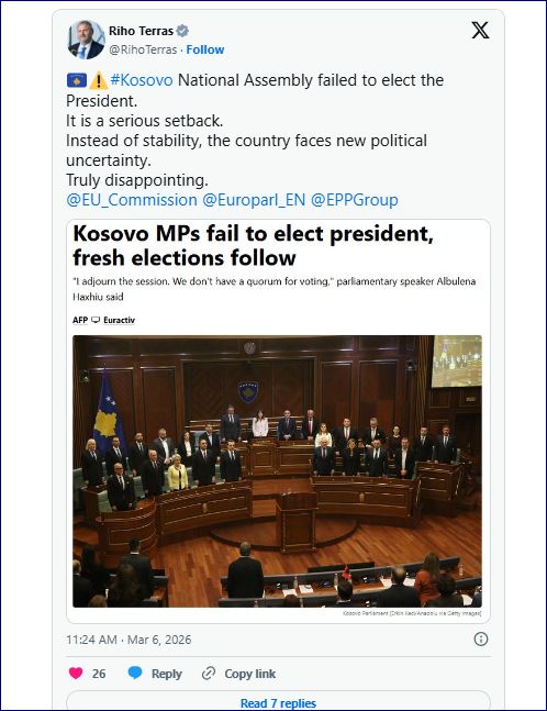 “Në vend të stabilitetit, vendi përballet me pasiguri të re politike. Vërtet zhgënjyese”, shkroi Terras në një postim në rrjetin social X, pasi Kuvendi nuk arriti ta përmbyllë procesin e zgjedhjes së presidentit.