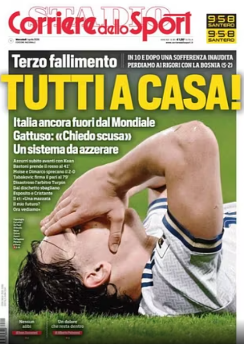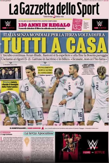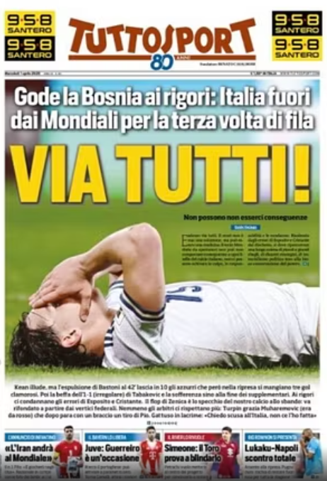 “Të gjithë në shtëpi. Italia pa Botëror për të tretën herë radhazi”, shkruan La Gazzetta dello Sport. “Të gjithë në shtëpi. Dështimi i tretë”, ishte titulli i përzgjedhur nga Corriere dello Sport. “Ikni të gjithë. Bosnje feston me penallti. Italia jashtë Botërorit për herë të tretë radhazi”, ishte titulli i përzgjedhur nga TuttoSport.