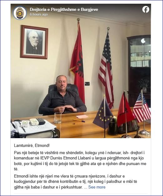 “Lamtumirë, Etmond! Pas një beteje të vështirë me shëndetin, kolegu ynë i nderuar, ish- drejtori i komanduar në IEVP Durrës Etmond Llabani u largua përgjithmonë nga kjo botë, por kujtimi i tij do të jetojë tek të gjithë ata që e njohën dhe punuan me të.