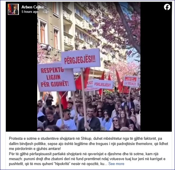 Mbështes çdo protestë studentore e qytetare, që bëhet për liritë dhe të drejtat e njeriut, për një Maqedoni europiane dhe demokratike si dhe inkurajoj qeverinë aktuale për të gjetur zgjidhje urgjente për kërkesat e studentëve shqiptarë”, shkruan ish-ambasadori Arben Çejku.
