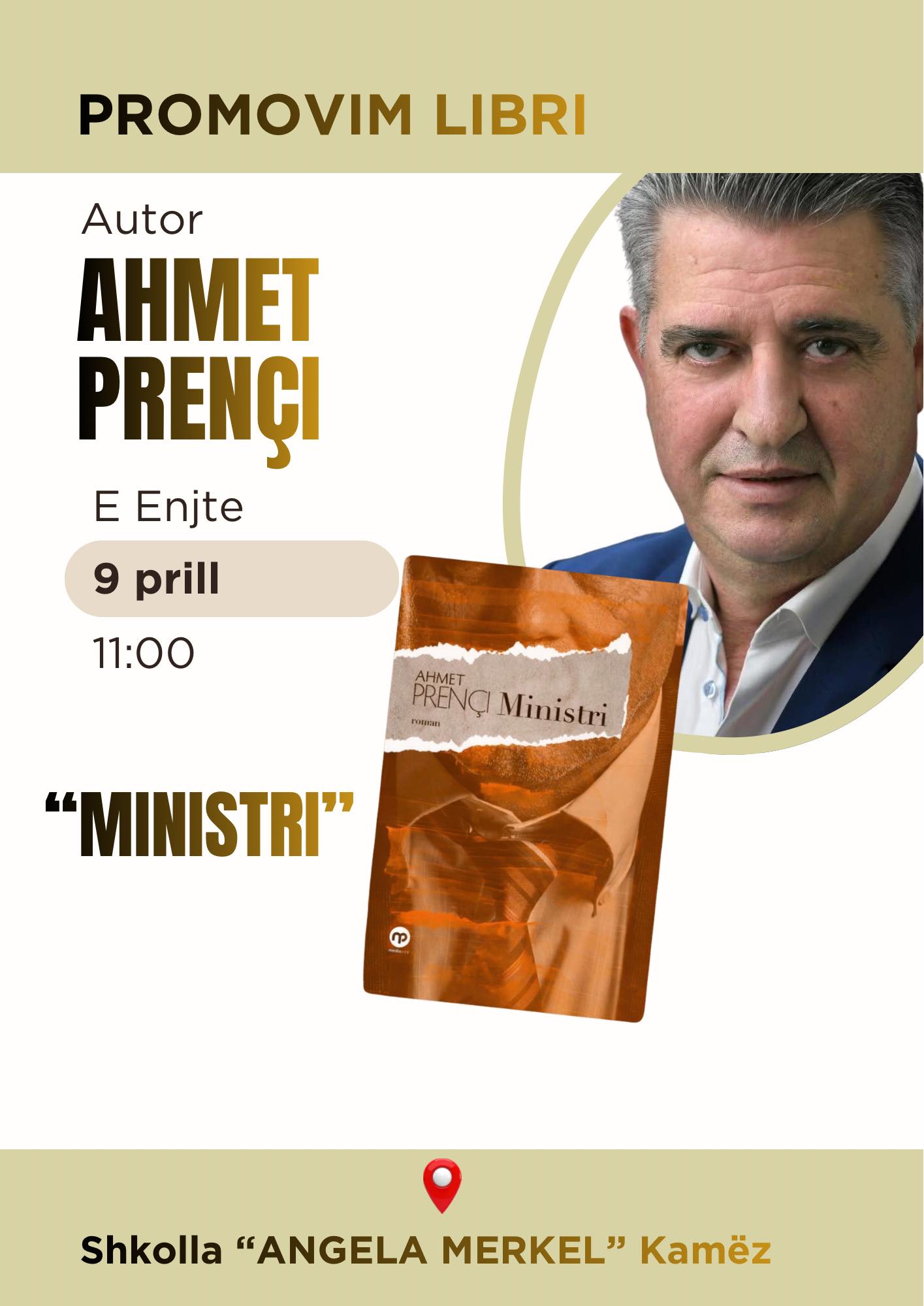 Sot në Kamëz promovohet libri më i ri i Ahmet Prençit, romani “Ministri”. Në sallë e shkollës “Angela Merkel” e cila pritet të jetë e tejmbushur fal organizimit të shtëpisë Botuese Mediaprint dhe Bashkisë Kamëz ku me qindra dashamirës të librit, shokë, miqë, kolegë, të afërm do të kenë mundësinë për të takuar nga afër shkrimtarin Prençi.