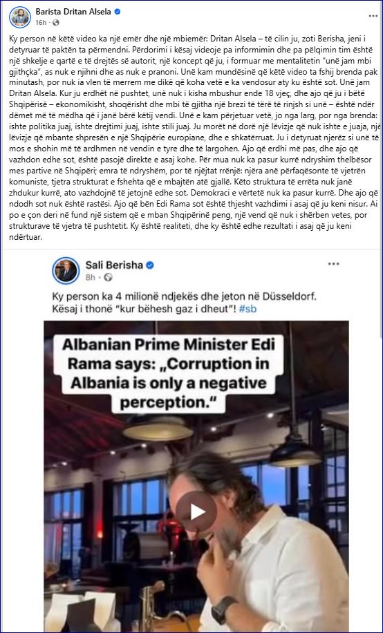 Baristi i famshëm shqiptar, (Videot e tij kanë miliona shikime), Dritan Alsela, i cili jeton dhe punon në Itali, ka reaguar ashpër ndaj Sali Berishës. Ky i fundit këtë të hënë përdori një video të Alselës me mbi 3 milion shikime, për të goditur Edi Ramën. Pas kësaj nëpërmjet një shënimi në faqen e tij FB, baristi i njohur i përvishet Berishës por edhe Ramës duke i cilësuar uzurpuesit e demokracisë shqiptsre dhe arsyeja e vërtetë, pse ai dhe miliona shqiptarë janë detyruar të braktisin vendin.