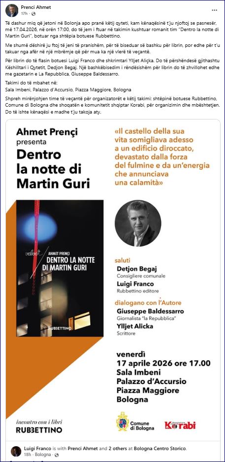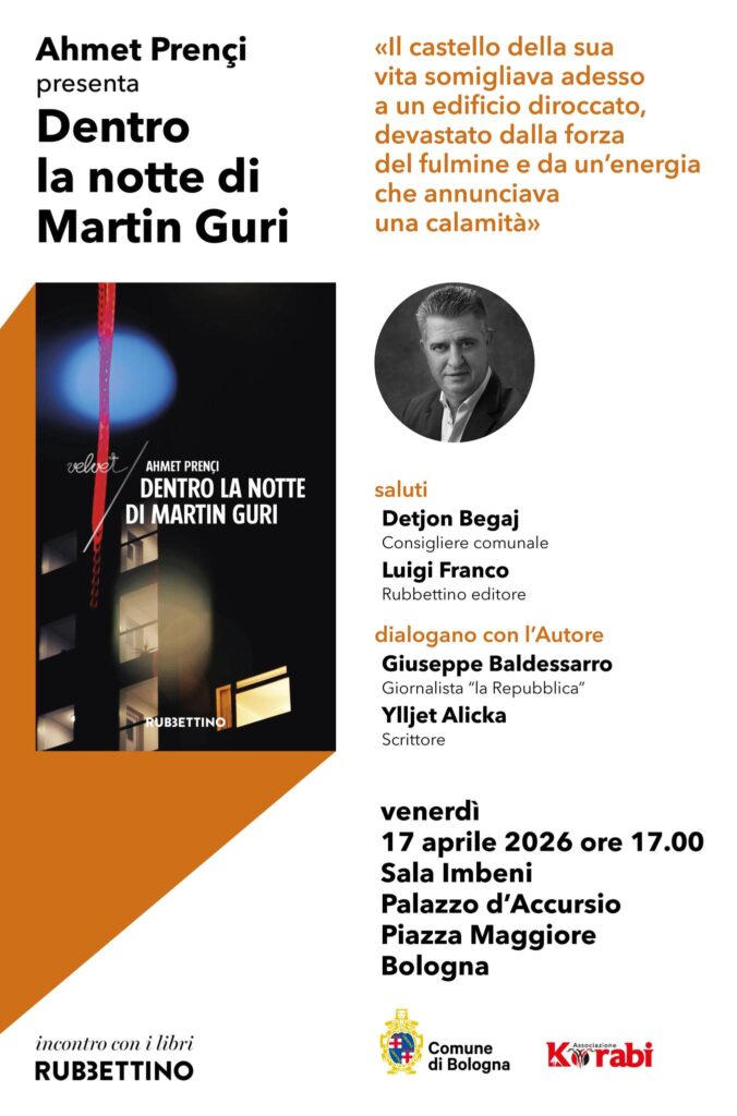 Të dashur miq që jetoni në Bolonja apo pranë këtij qyteti, kam kënaqësinë t’ju njoftoj se pasnesër, më 17.04.2026, në orën 17:00, do të jem i ftuar në takimin kushtuar romanit tim “Dentro la notte di Martin Guri”, botuar nga shtëpia botuese Rubbettino.