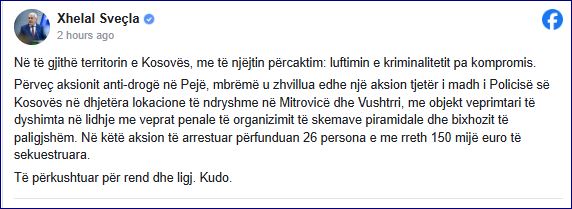 Përveç aksionit anti-drogë në Pejë, mbrëmë u zhvillua edhe një aksion tjetër i madh i Policisë së Kosovës në dhjetëra lokacione të ndryshme në Mitrovicë dhe Vushtrri, me objekt veprimtari të dyshimta në lidhje me veprat penale të organizimit të skemave piramidale dhe bixhozit të paligjshëm. Në këtë aksion të arrestuar përfunduan 26 persona e me rreth 150 mijë euro të sekuestruara.Të përkushtuar për rend dhe ligj. Kudo”, shkroi ministri Sveçla.