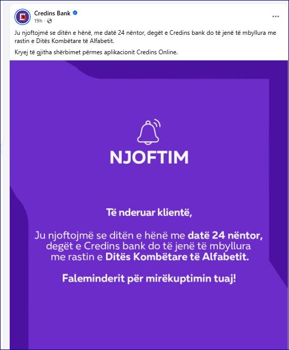 Ju njoftojmë se ditën e hënë, me datë 24 nëntor, degët e Credins bank do të jenë të mbyllura me rastin e Ditës Kombëtare të Alfabetit. Kryej të gjitha shërbimet përmes aplikacionit Credins Online.