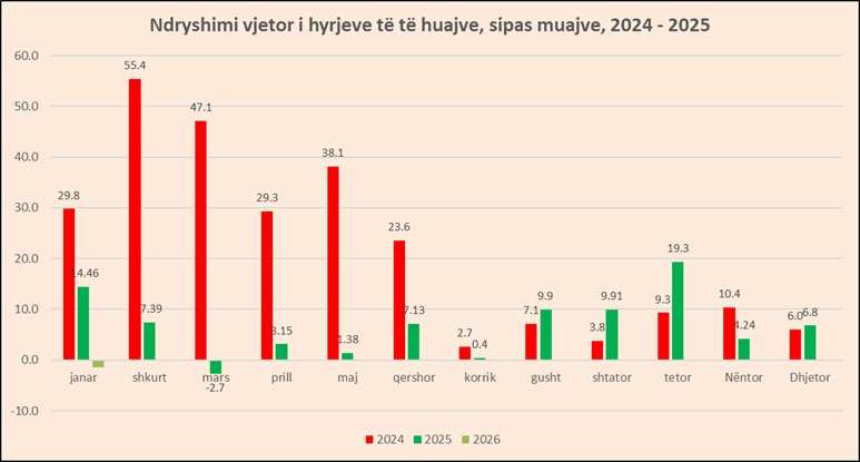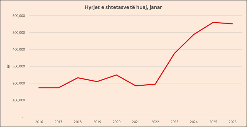 Për krahasim, në janar 2025, hyrjet e të huajve u rritën me 14.5%, ndërsa në 2024-n zgjerimi ishte gati 30%.